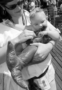 纽约近日举行了第26届“美人鱼”游行。游行以海底世界为主题,参加者使出浑身解数把自己装扮成传说中的“美人鱼”以及各种海底生物,游行吸引了数十万人观摩。图为在美国纽约康尼岛海滨,一名被打扮成“美人鱼”的小女孩被大人抱着参加游行.