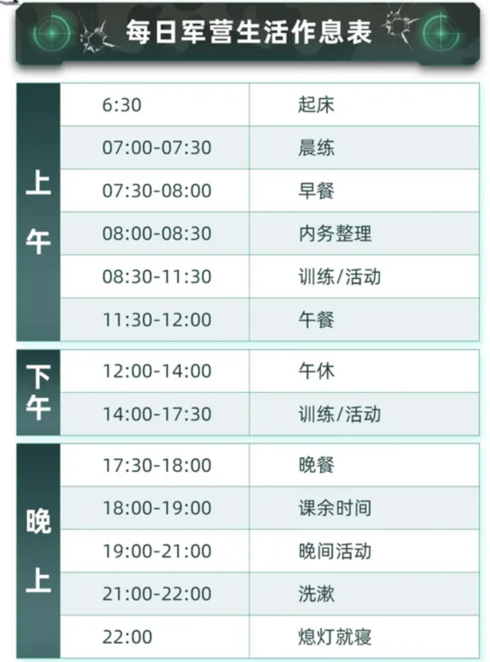 住宿标准:宿舍为标准化军营配置,干净整洁,空调、24小时热水、独立卫浴一应俱全;生活老师夜间定时查寝,关注孩子睡眠状态。