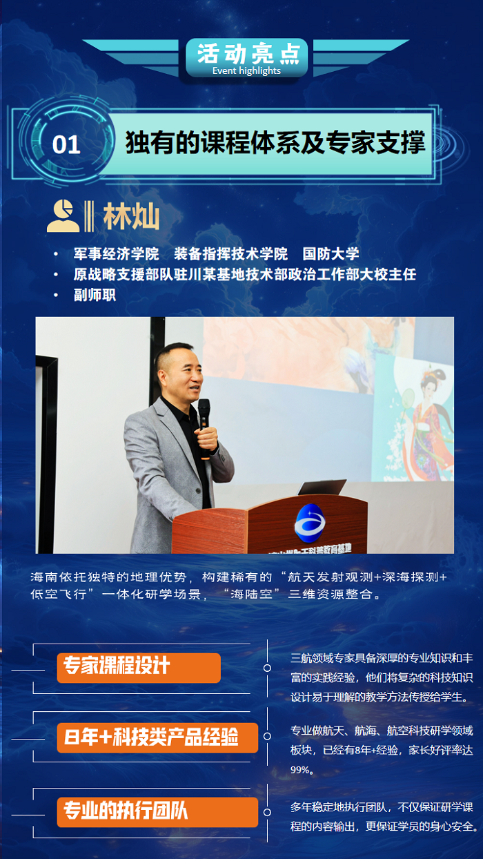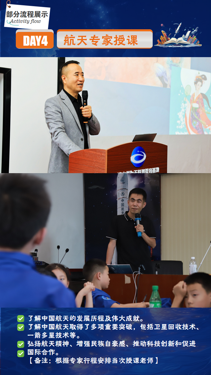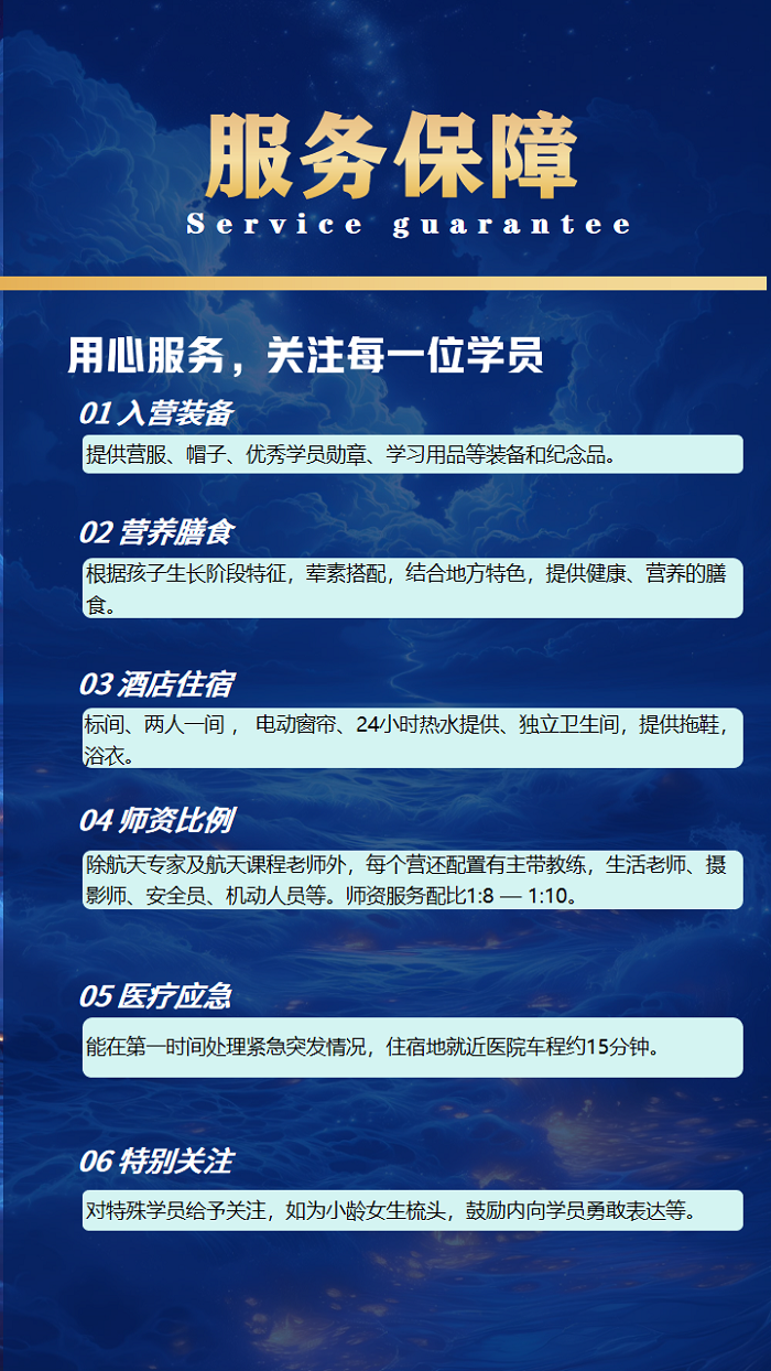 师资配比:1:8-1:10,除航天专家及航天课程老师外,每个营还配置有主带教练,生活老师、专业摄影、安全员、机动人员等