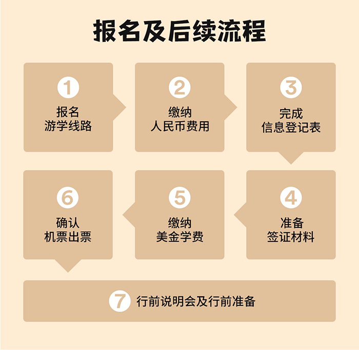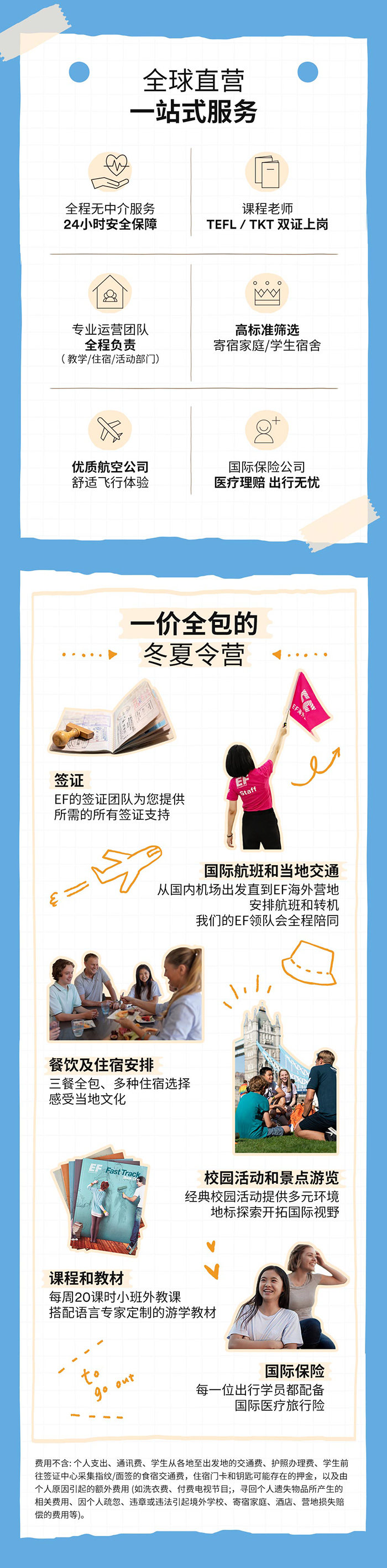 费用不含:个人支出、通讯费、学生从各地至出发地的交通费、护照办理费、学生前往签证中心采集指纹/面签的食宿交通费,住宿门卡和钥匙可能存在的押金,以及由个人原因引起的额外费用(如洗衣费、付费电视节目、寻回个人遗失物品所产生的相关费用、因个人疏忽、违章或违法引起境外学校、寄宿家庭、酒店、营地损失赔偿的费用等)