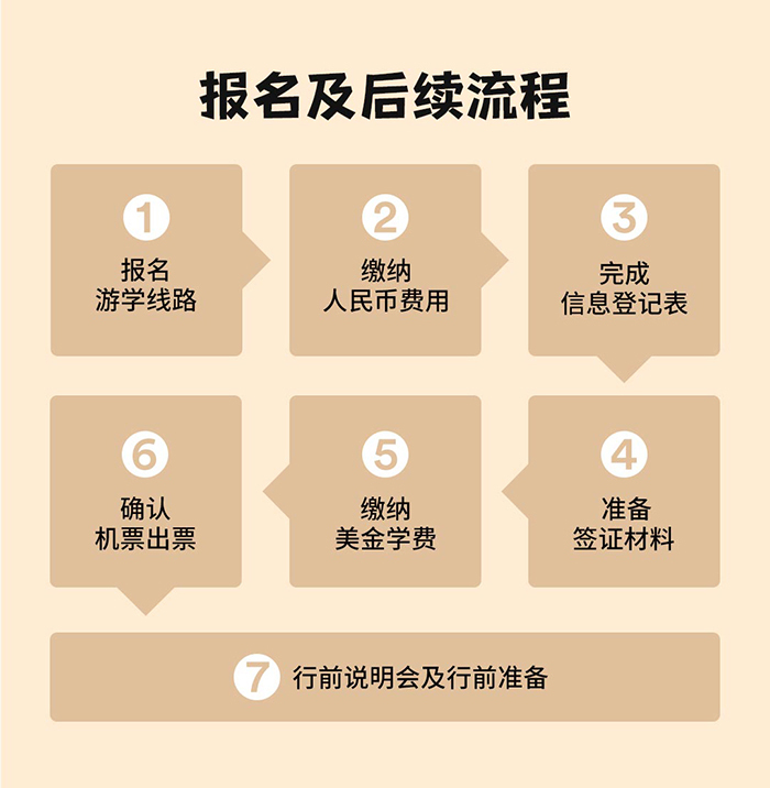 费用不含:个人支出、通讯费、学生从各地至出发地的交通费、护照办理费、学生前往签证中心采集指纹/面签的食宿交通费,住宿门卡和钥匙可能存在的押金,以及由个人原因引起的额外费用(如洗衣费、付费电视节目、寻回个人遗失物品所产生的相关费用、因个人疏忽、违章或违法引起境外学校、寄宿家庭、酒店、营地损失赔偿的费用等)