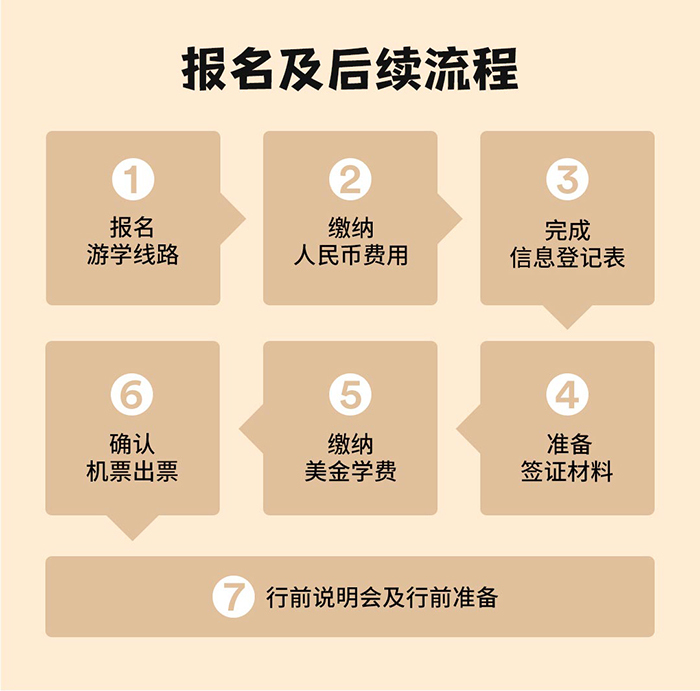 费用不含:个人支出、通讯费、学生从各地至出发地的交通费、护照办理费、学生前往签证中心采集指纹/面签的食宿交通费,住宿门卡和钥匙可能存在的押金,以及由个人原因引起的额外费用(如洗衣费、付费电视节目、寻回个人遗失物品所产生的相关费用、因个人疏忽、违章或违法引起境外学校、寄宿家庭、酒店、营地损失赔偿的费用等)