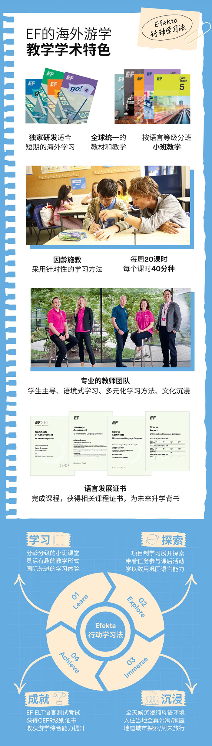 2、国际航班和当地交通:从国内机场出发直到EF海外营地安排航班和转机,我们的EF领队会全程陪同
