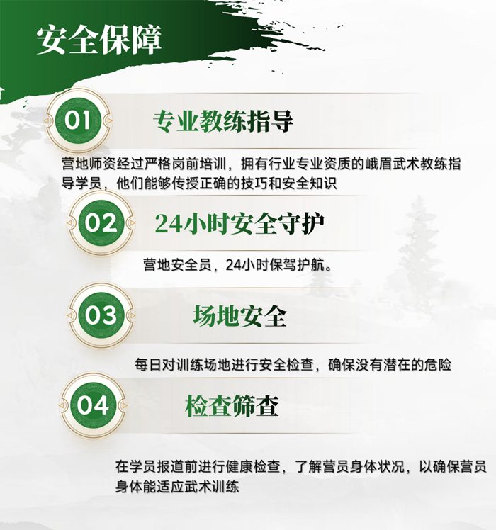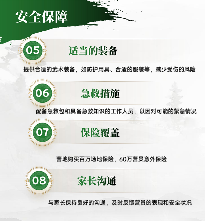 1、报名入营:请提前一天入营,到达营地由学校统一发放武术服装,鞋子,武术器械,学习用品。