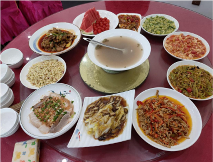 餐饮标准:四荤五素一汤桌餐,外加水果
