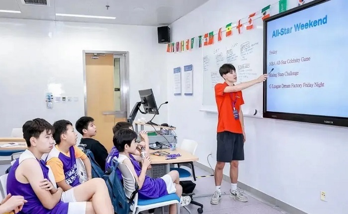 全英文环境是我们篮球营的核心亮点。从踏入营地的那一刻起,孩子们便置身于英语的海洋。无论是篮球场上教练的指令,如 “Dribble faster!(快点运球!)”“Pass the ball!(传球!)”,还是晚上课堂上的交流互动,都只用英语进行。这种沉浸式的体验,让孩子们无需刻意学习语法,就能在实际场景中自然掌握篮球英语,培养英语思维,就像身处美国篮球训练营一般真实!