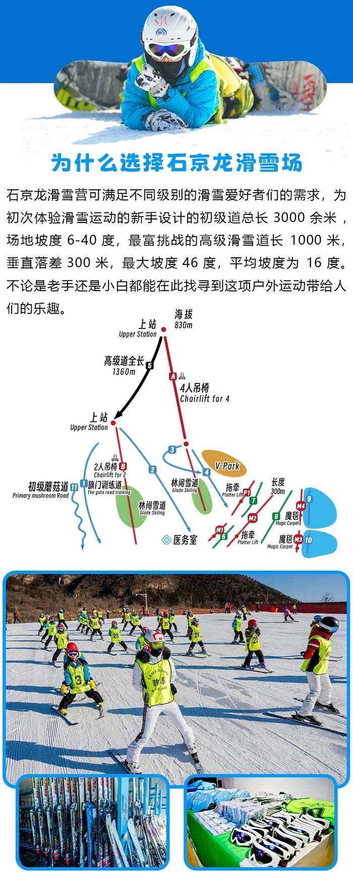 4、全程雪具、雪服、头盔、雪镜租赁及缆车魔毯使用费,场内器材、物料使用等;