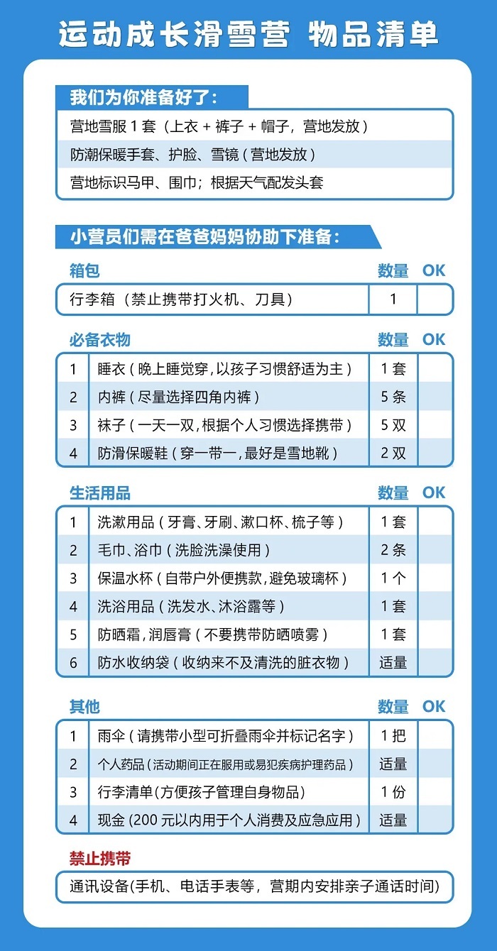2.滑雪营期间不可使用任何电子设备,如携带由营地暂保管,结束时归还。