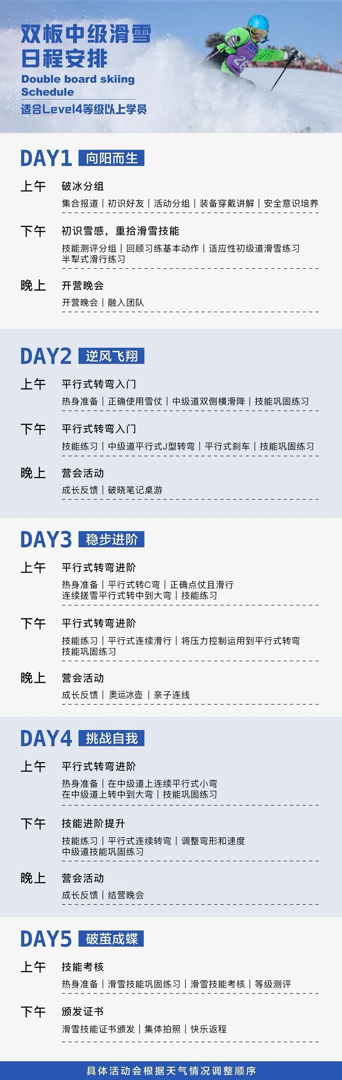 滑雪冬令营课程从孩子的兴趣爱好出发,分设双板和单板两种滑雪课程。由专业团队遵循儿童滑雪教学体系,细分等级,设计出适宜的课程安排。