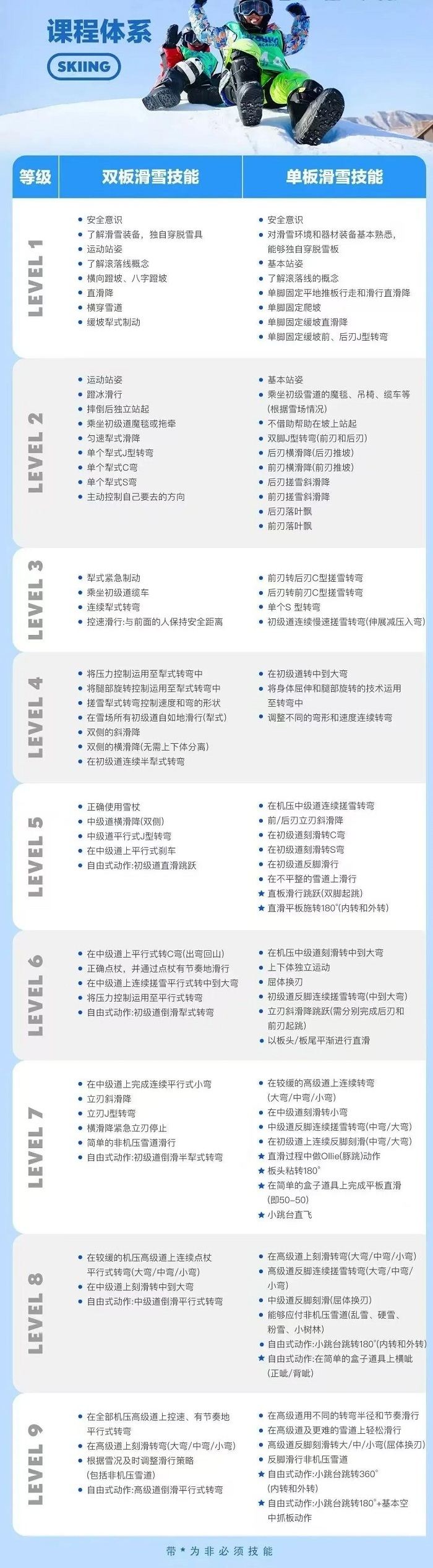 结合全球各大滑雪体系,以「北京大众滑雪锻炼等级标准」为总纲,打磨出了更适合中国青少年体质的1-9级进阶式教学体系,高效培养滑雪技能,专业学习考核。