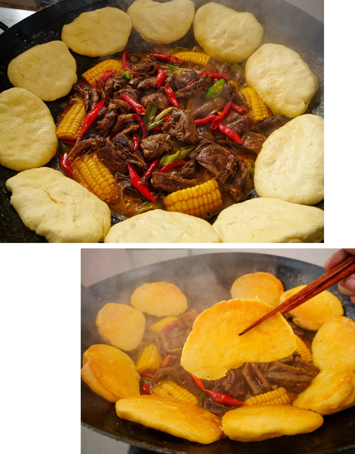待大火烧开后,沿着锅边贴上玉米饼子,再放入粉条。听着咕嘟咕嘟的声音正是各种食材美味的碰撞声!