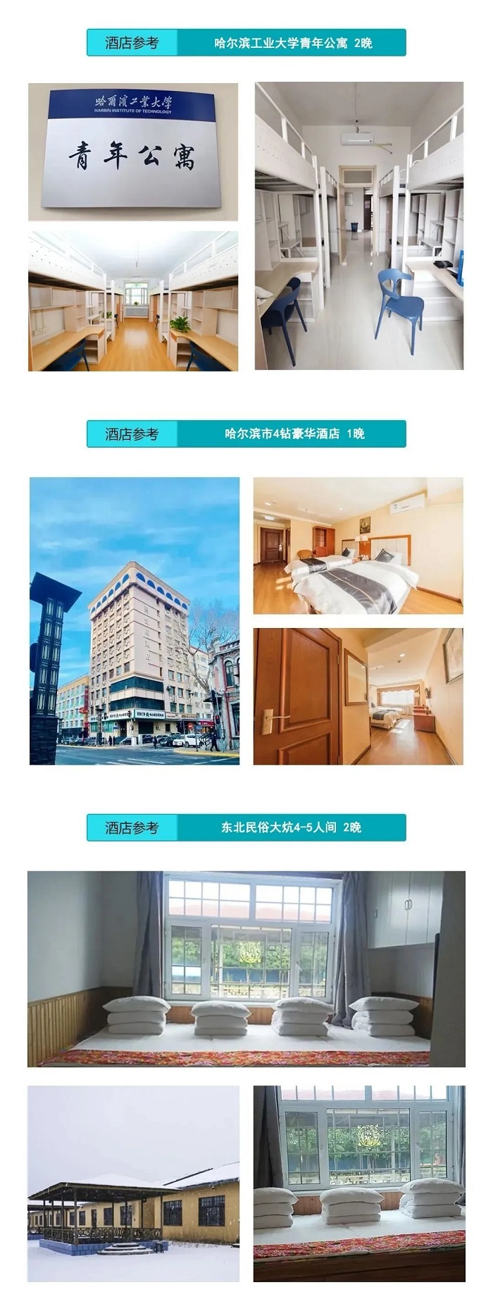 1、住宿标准:2晚哈工大宿舍(哈工大如遇特殊情况改住酒店),2晚东北大炕,1晚4钻酒店;