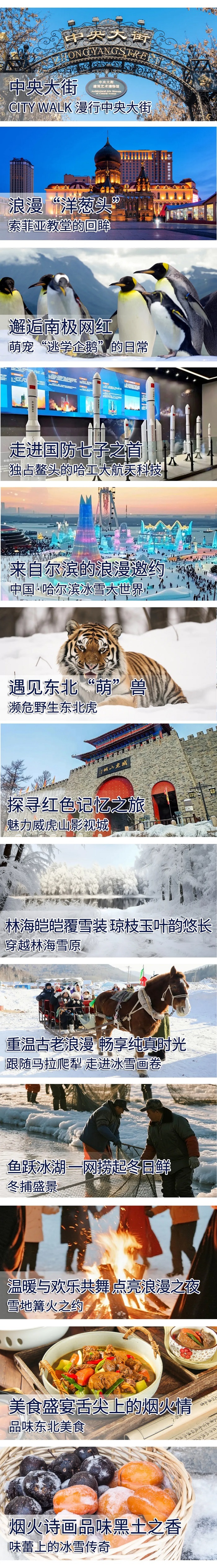 中央大街、索菲亚教堂、哈尔滨工业大学航天馆、冰雪大世界、淘学企鹅馆、横道河子镇、东北虎林园、威虎山影视城、林海雪原、冰雪运动嘉年华