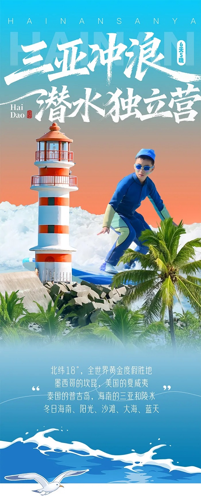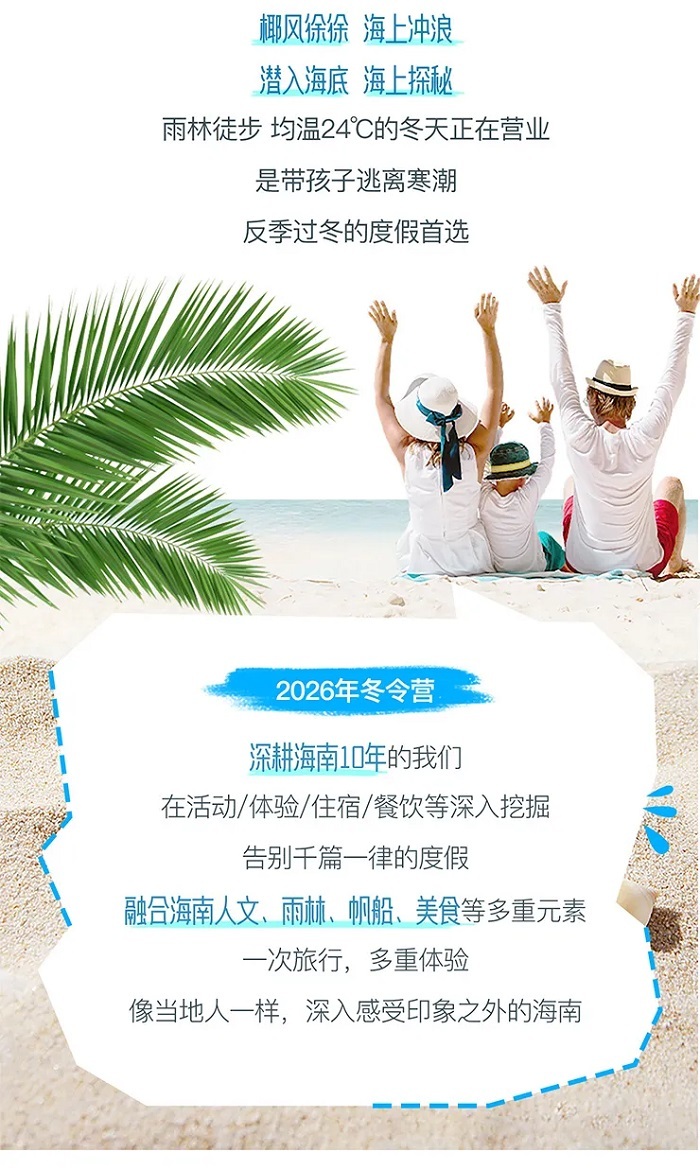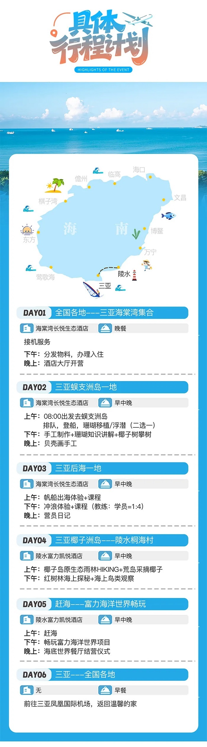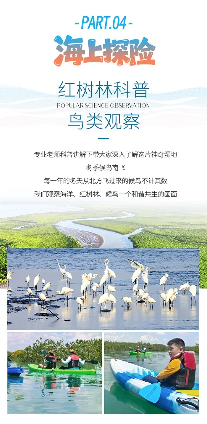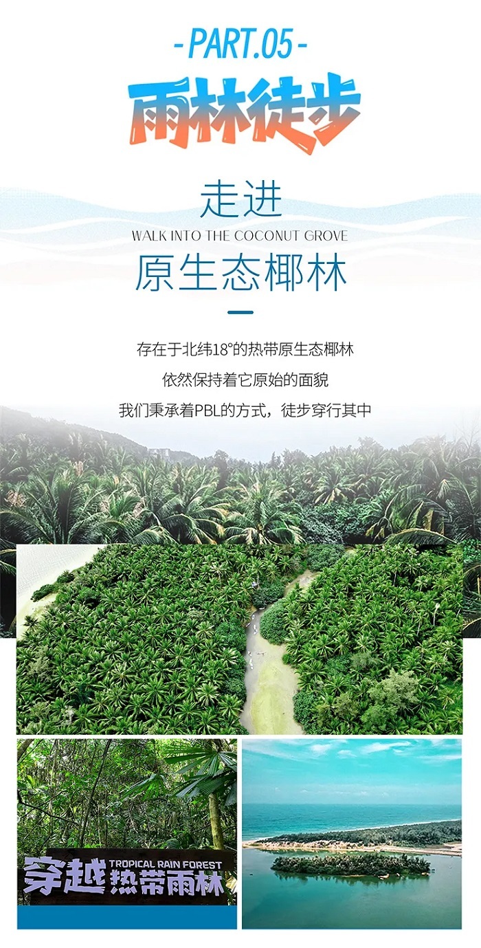 5、活动:富力海洋世界畅玩、潜水或珊瑚种植、冲浪、帆船、红树林研学、赶海,雨林徒步、采摘椰子、贝壳手工、鸟类观察