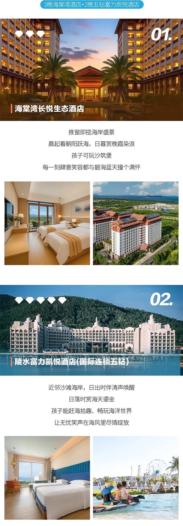 2、住宿: Day1-3三亚长悦生态酒店3晚(4钻)2人/标间双床(1.2m*2m)、Day4-5富力凯悦酒店2晚(5钻)2人/标间双床(1.2m*2m)