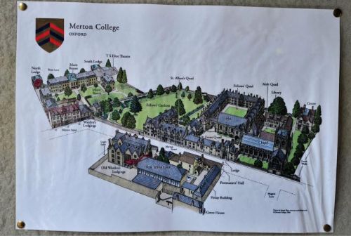 在牛津众多的大学中,默顿学院算是比较小巧的一个,从门口的这张俯瞰图便可看出一二。