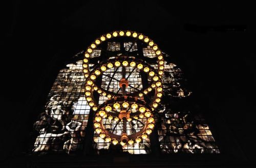 礼拜堂内很安静,漂亮的玻璃彩绘,还有那灯饰。
