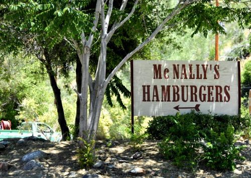 美国独立纪念日那个长周末,我们驱车来到了巨杉国家森林(sequoia national forest).在欣赏了伊萨贝拉湖(lake isabella),和小镇克恩维尔(kernville)的风光后,我们开车继续前行.走着走着,路边一个汉堡包的大招牌闯入了我们的视线,看见它立刻引发了我们的饥饿感,到了该填肚子的时候了.于是,在招牌的召唤下我们停了车.这里是一个微型小镇,仅有几栋房子,一个汽车旅馆,一个小商店,还有一个小餐馆却没有开门.只有那个大招牌所指的卖汉堡包的小房子前生意兴隆.这是一个家庭小店,除了过往的游客,一些国家森林的工作人员也来这里就餐.我们各自要了一个加了培根的大汉堡,现烤现卖,味道好极了。