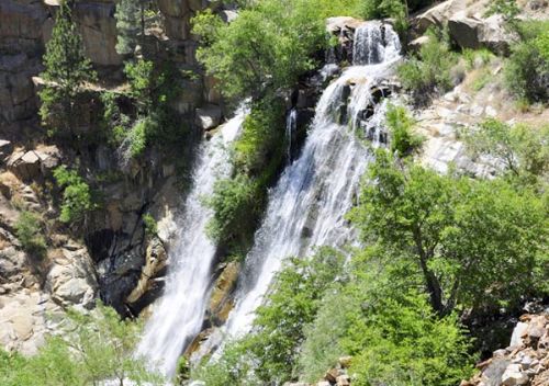 离开小镇继续前行.林子渐渐地密了起来.忽然,一条飞泻而下的瀑布进入了我们的眼帘.我们赶紧在瀑布边上停下车来.停车的位置是在瀑布的顶端,看不到瀑布的全景,我们必须沿着公路走一小段路才能看到它的全貌.瀑布的名称是南溪瀑布(south creek falls).瀑布虽然不大,但它着实给了我们一阵惊喜.随着公路的海拔高度逐渐增加,那条蜿蜒的小河慢慢地不见了。