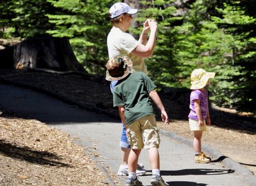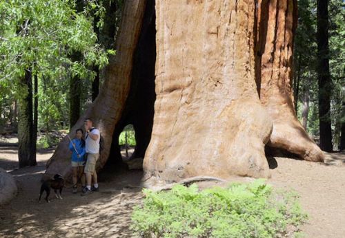 按照路标指示的方向,我们沿着一条蜿蜒的小路进入了巨杉林.虽然几年前去过巨杉国家公园,但眼前的一切还是又一次让我们感到震撼.站在这些挺拔高大的巨杉前,我们感觉自己是那么的渺小.有些巨杉显然是被山火烧过,形成了巨大的树洞,里面藏十来个人看来都不成问题.令人惊讶的是,这些巨杉仍然活着,枝繁叶茂,显示着"世界爷"顽强的生命力。