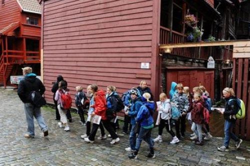 我们走进木屋群,后面还有不少建筑,由于卑尔根的旅游旺季刚过,游客不是很多,连最老的一家餐厅bryggen tracteursted 都关着门。看着一队小学生从一个门里出来,jim带着我们走过去,指着一个二层小楼,“那里便是二战时期挪威地下抵抗运动的联络处”。猫猫睁大眼睛,好奇地打量着眼前的小楼,脑海中浮现出二战电影里的场景:一个地下抵抗组织成员推着自行车,那时的挪威人最常用的交通工具。