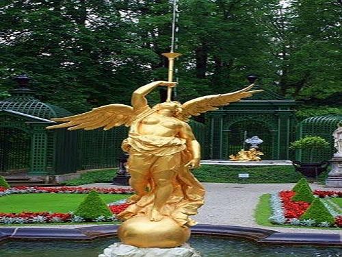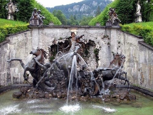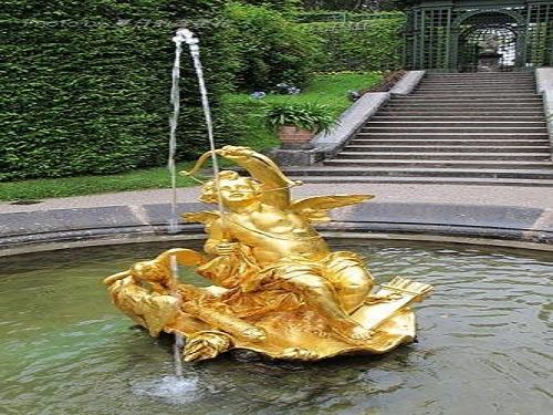 林德霍夫宫面对的这个大水池,使花园灵动了起来。一个花园要想有灵气,怎能缺少水呢?怎能缺少喷泉呢?林德霍夫宫的花园内,处处都有造型别致的喷泉。