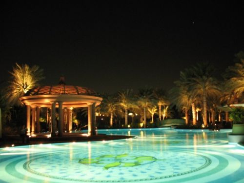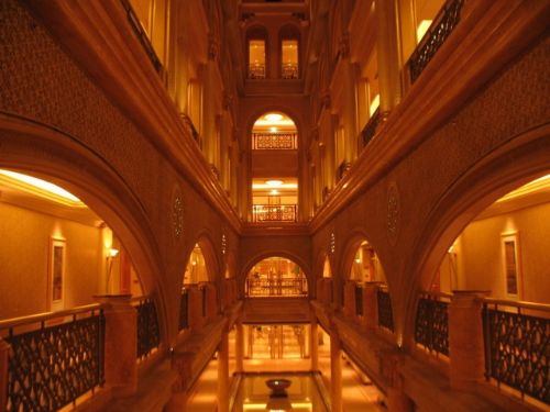 在阿拉伯世界的建筑审美观里,“宏大”是永远的追求。酋长宫酒店是一座对称式巨型建筑,以中庭为中心,两侧坐落东西翼楼及相似的活动场所,仅两翼楼间的距离长达1公里,在里面迷路是很正常的,问路也是很正常的,每天吃早饭的时间也是锻炼身体的时间。