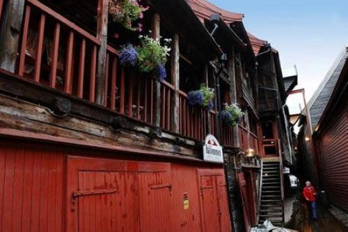 13世纪挪威人用鱼干、黄油、毛皮等产品与英国、德国交易谷类、红酒和蜂蜜等货物,木屋群一层是货仓,二楼是住所,只是里面全部是男人,有上千人之多,经过三百年的海风雨水侵蚀。