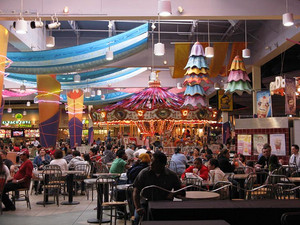 美国的亚利桑那购物中心(ari-zonacenter)是集购物、娱乐、餐饮、办公等于一体的复合型商业设施。两个精心设计的室外庭院将三层高的“l”型建筑群与一座两层的弧型建筑及一座办公塔楼有机联系起来,很好地发挥了群体空间的综合效益。“l”型建筑群的一二层主要为商店,三层为办公区,中间的弧型建筑集中设置购物、娱乐及餐饮,处理上较为自由与开敞。中心的大型半开敞花园式广场使得该综合体成为文化交流的媒介。别致怡人的小桥流水、高大的热带棕榈树等,赋予空间一种宜人尺度,营造出亲切、自然又充满时尚的氛围。