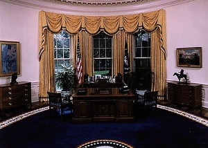 白宫有四个椭圆形大厅,其中黄色椭圆形大厅是会客室;绿色椭圆形大厅是总统的起居室;红色椭圆形大厅是总统办公室。总统办公室不对外开放,据说总统的办公室是用一艘失事海船的木料做的,是1880年维多利亚女王送给海斯总统的礼品,一直使用至今。桌上有一句座右铭:“如果一个人不在乎谁来获得荣誉,那么他能做的事和能去的地方永无止境。”