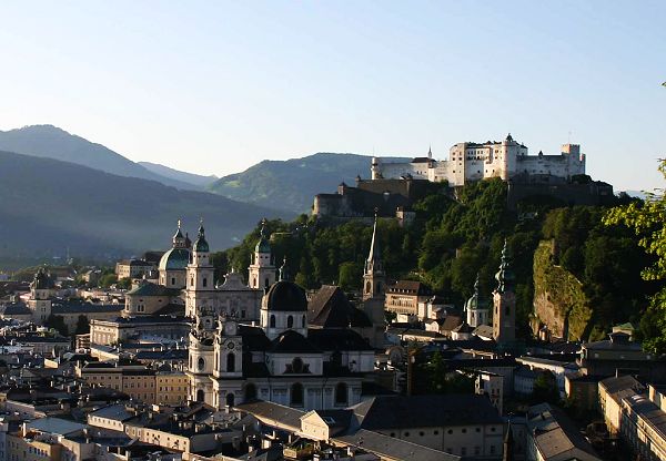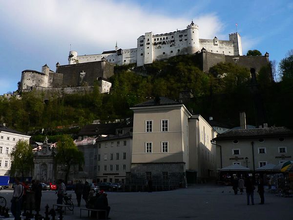 自1892年起乘城堡小路上的缆车可以很方便地到达城堡。 萨尔茨堡要塞作为莫扎特故乡的标志完全保持了中欧城堡的风格。这座有超过900年历史的建筑物的初建可以追述到授职之争时期。当时发生了教皇与国王之间的主教任命权力的争夺。忠于教皇的萨尔茨堡主教格博哈德于1077年在其领地上萨尔茨堡,上沃尔分,弗里萨赫建造了防御建筑。格博哈德的防御设施在康拉德一世(1160-1147)的领导下全部完成。