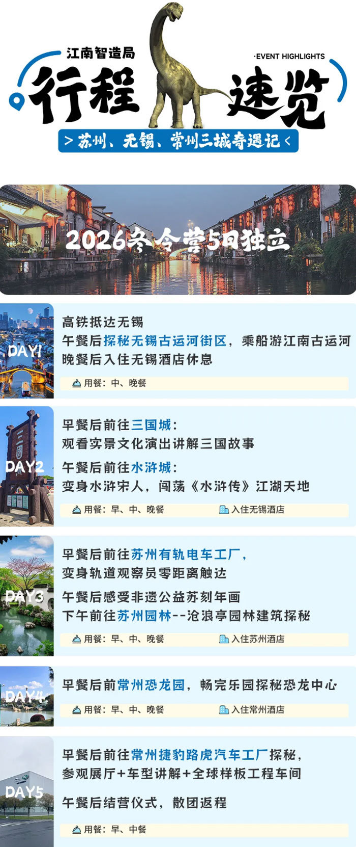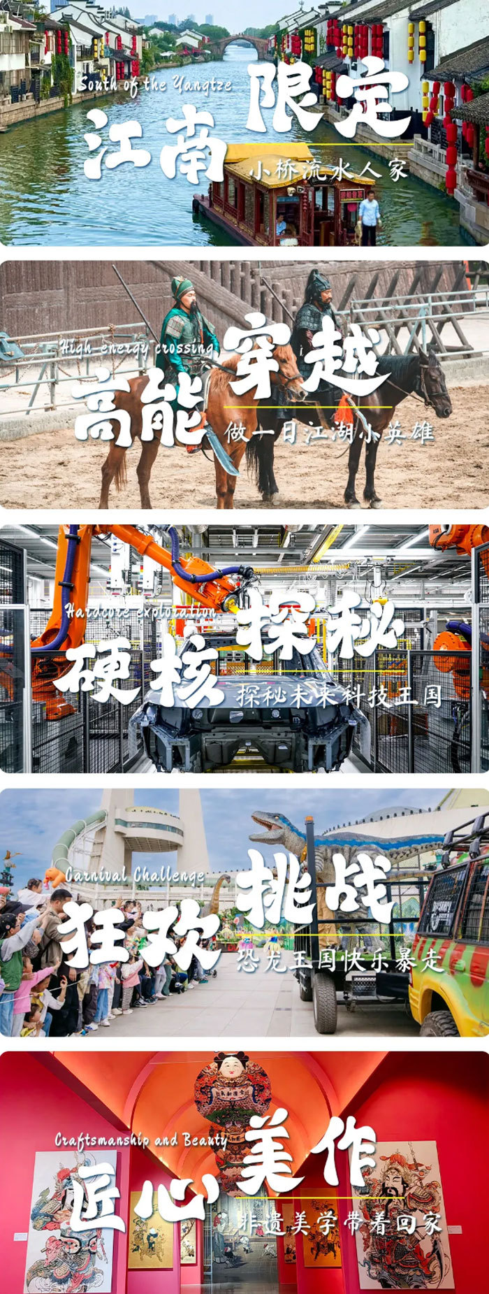 无锡古运河街区、三国城、水浒城、苏州有轨电车工厂、苏州园林、常州恐龙园、常州捷豹路虎汽车工厂