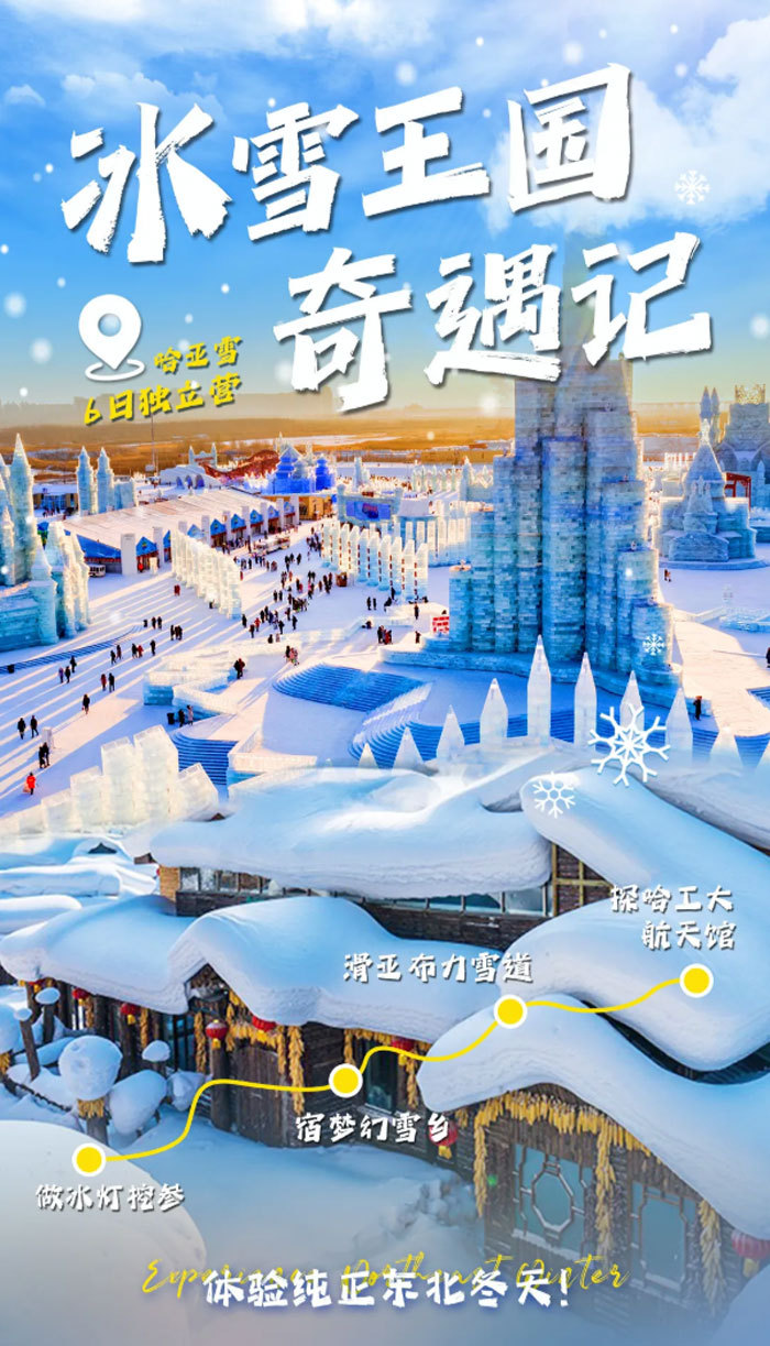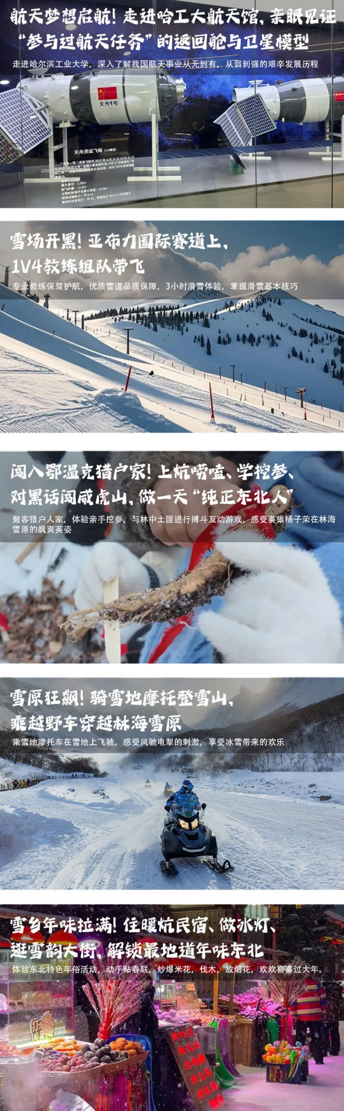 中央大街、圣索菲亚大教堂、中东铁路桥、哈尔滨工业大学、亚布力滑雪场、东北特色民俗文化园、雪乡、大秃子顶山