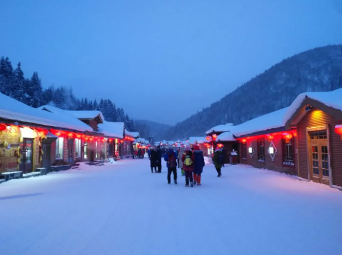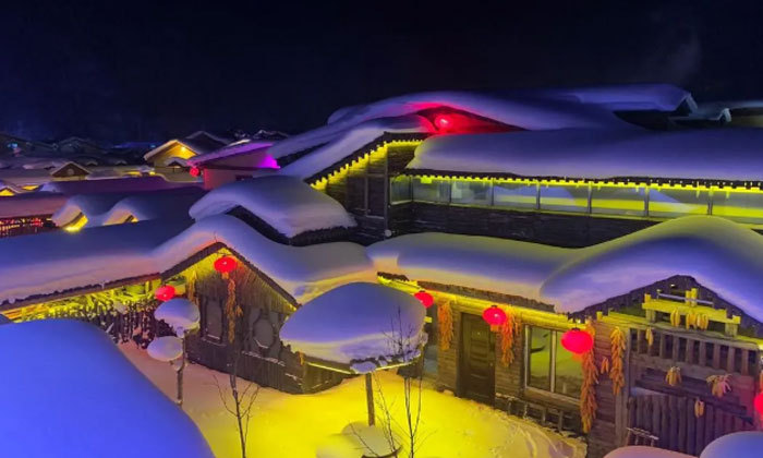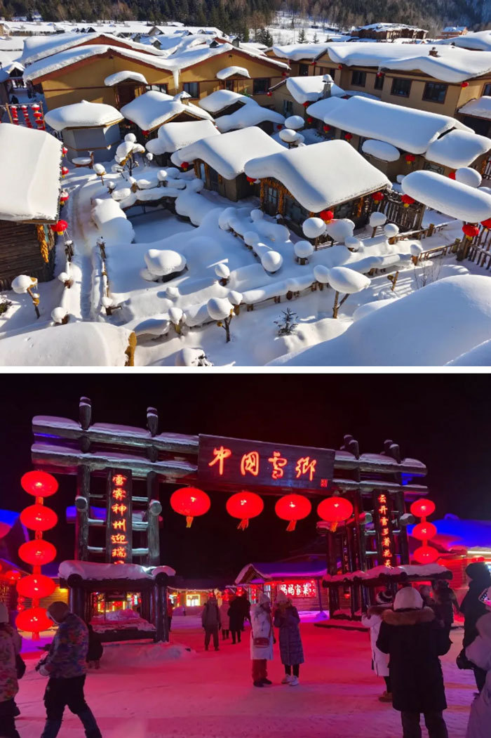 从亚布力雪场的皑皑白雪,到雪乡蘑菇屋旁的红灯笼
