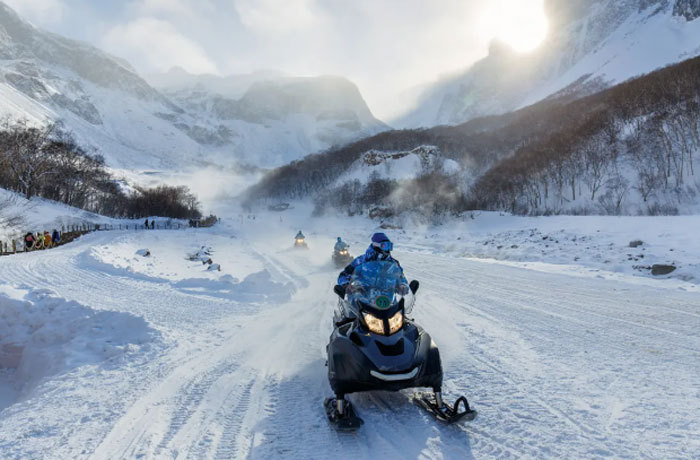 到达山顶后,眼前树林消失了,云雾就在脚下,生长在高山上桦树也退到了后边,成为花丛中的点缀,天空豁然开朗,群山已在脚下。乘雪地摩托车在雪地上飞驰,感受风驰电掣的刺激,享受冰雪带来的欢乐。