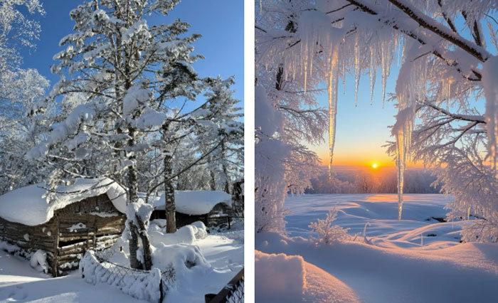 冰雪画廊则是雪与树、林与雪的完美结合,树木被厚厚的积雪包裹,形成了千姿百态的雪蘑菇、雪房子等景观,犹如一幅天然的水墨画。