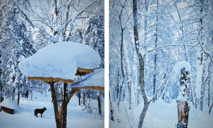 冰雪画廊则是雪与树、林与雪的完美结合,树木被厚厚的积雪包裹,形成了千姿百态的雪蘑菇、雪房子等景观 ,犹如一幅天然的水墨画。