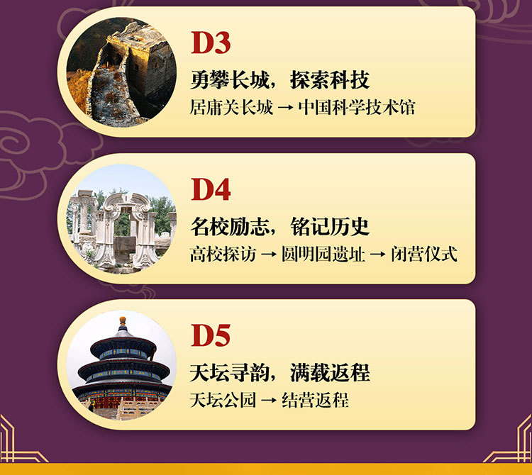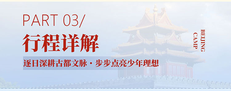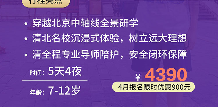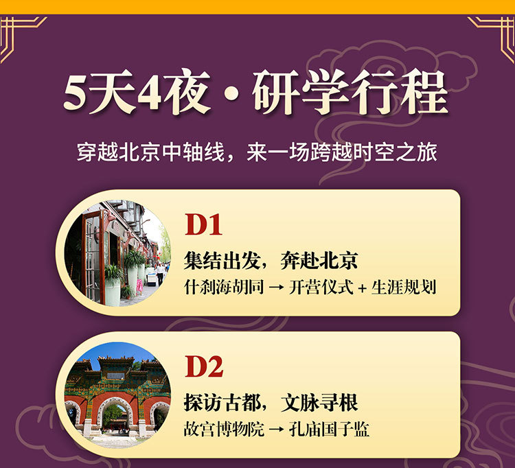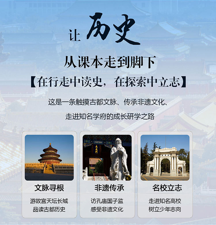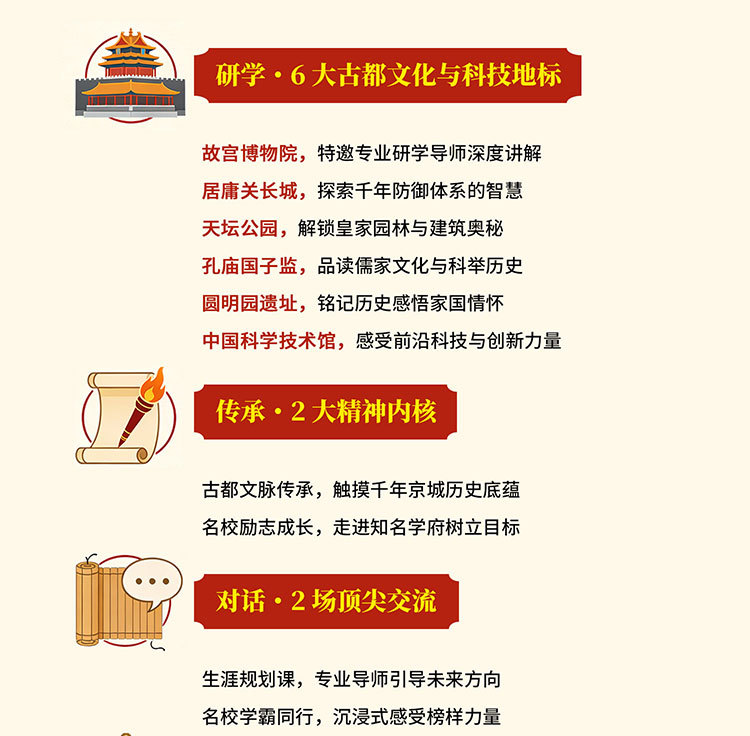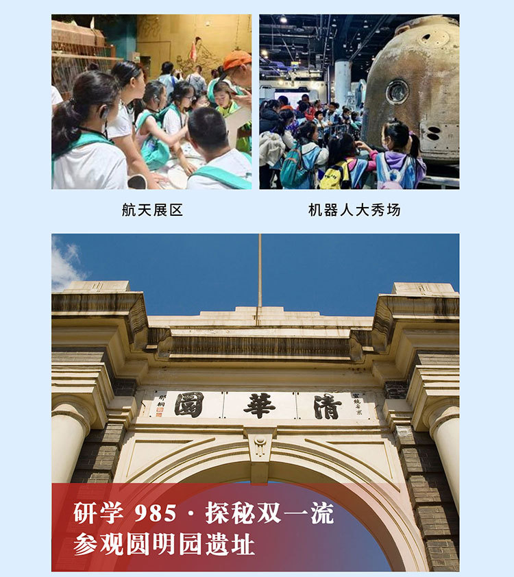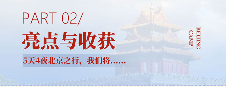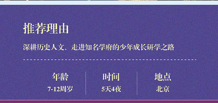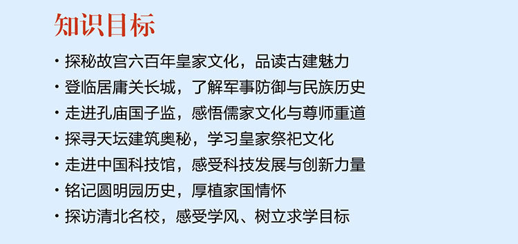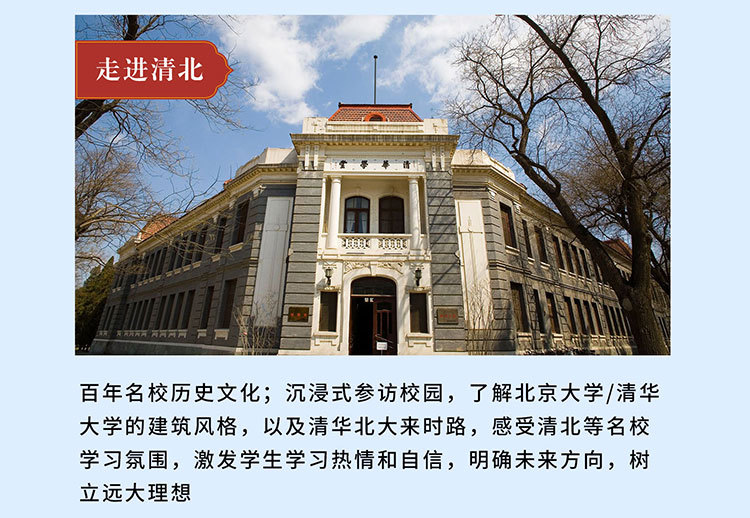 课 1:百年名校历史文化;沉浸式参访校园,了解北京大学/清华大学的建筑风格,以及清华北大来时路,感受清北等名校学习氛围,激发学生学习热情和自信,明确未来方向,树立远大理想