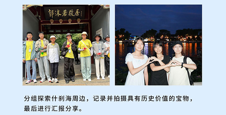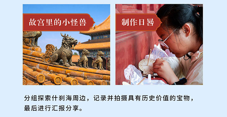课 1:跟着导师,参观什刹海周边的胡同和历史建筑,了解其背后的历史故事,以及了解什刹海地区的历史变迁与胡同文化,增强对北京城市历史的认同感。课 2:分组探索什刹海周边,记录并拍摄具有历史价值的“宝物”,最后进行汇报分享。