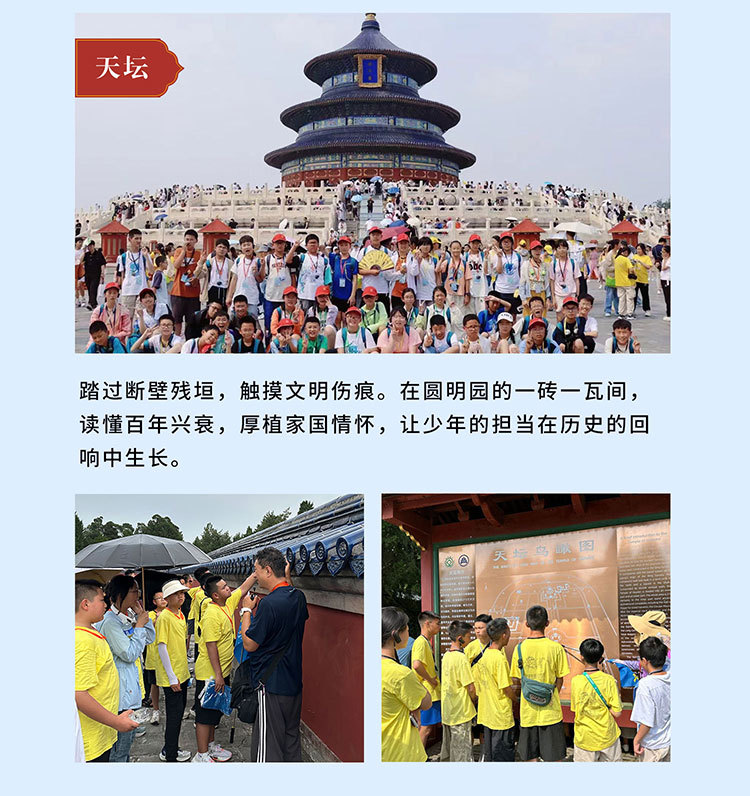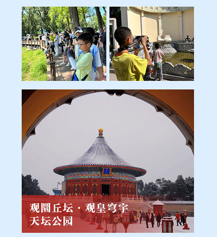 课 3:天坛的自然课堂;天坛公园内有 6 万多株树木,包括古松柏、古槐等珍稀树种,学生们可以通过观察、记录和分类,了解不同植物的形态、生长习性和生态价值。打卡“邓小平爷爷的树”。