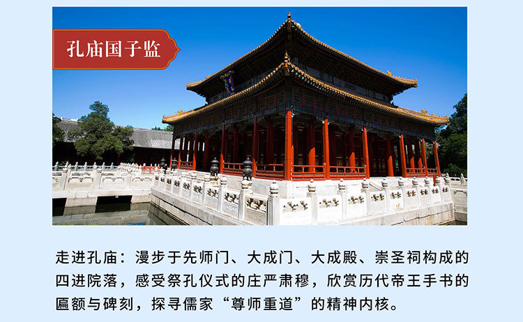 课 2:探访国子监:穿过集贤门、太学门,驻足琉璃牌坊与辟雍殿,想象古代“监生”在此研习经书的场景,了解元、明、清三代教育制度的变迁。尤其是清乾隆年间增建的辟雍殿,金碧辉煌的黄色琉璃瓦屋顶、环绕圜水的白玉石桥,宛如一幅历史画卷。