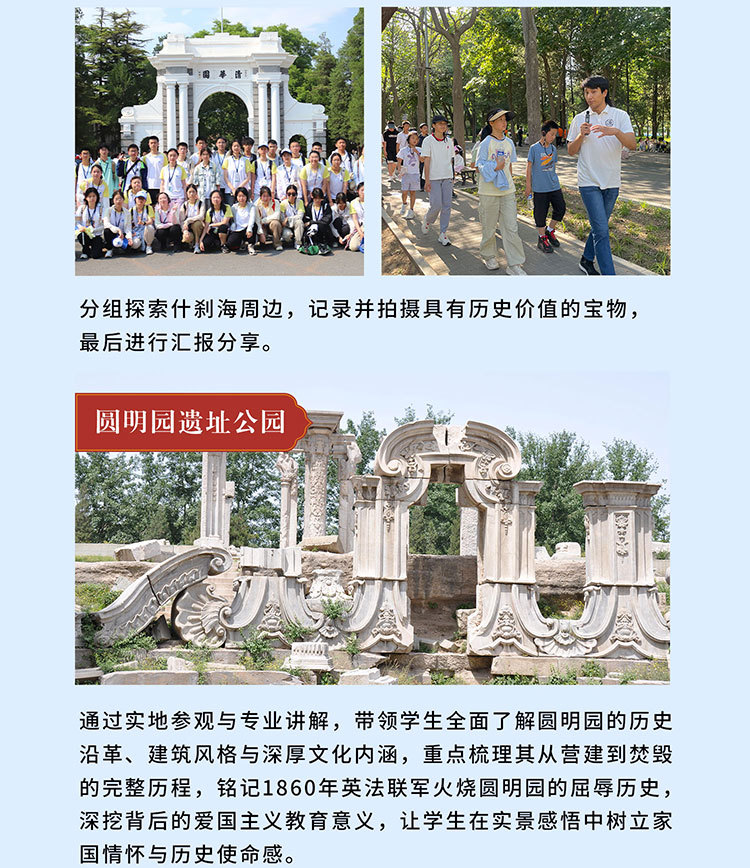 课 1:通过实地参观和讲解,让学生了解圆明园的历史沿革、建筑风格及背后的文化内涵,特别是其屈辱历史和爱国主义教育意义。了解其从修建到被毁的历程,特别是1860 年英法联军攻占并烧毁圆明园的历史事件。课 2:观察和学习圆明园的建筑特点、结构布局以及材料使用,感受皇家园林的精致与辉煌。