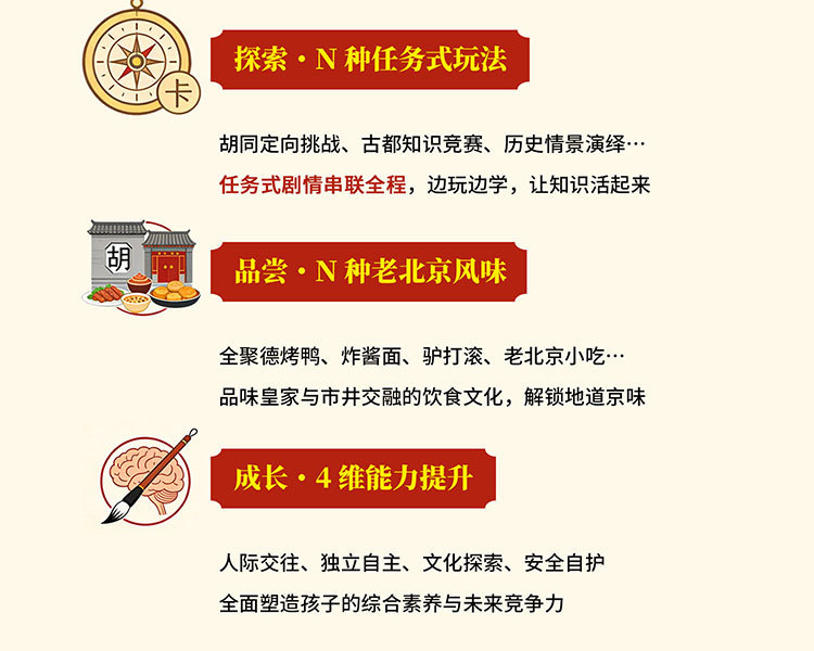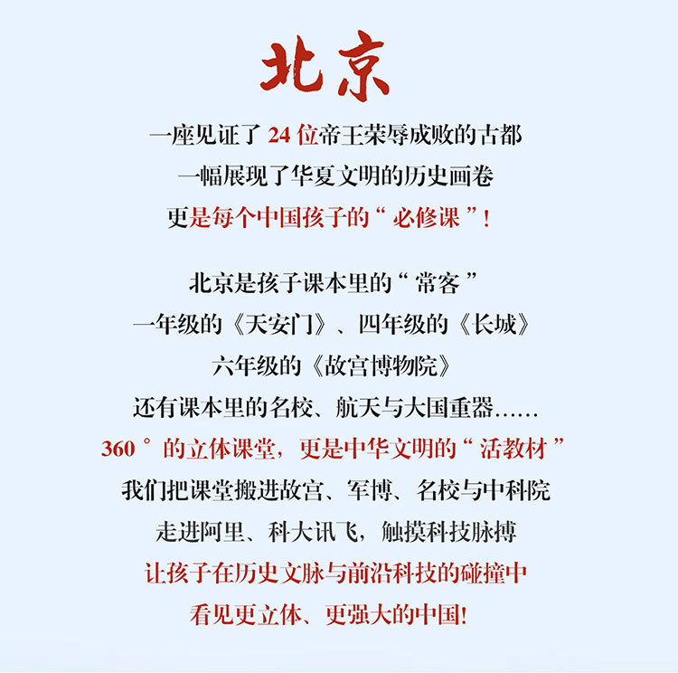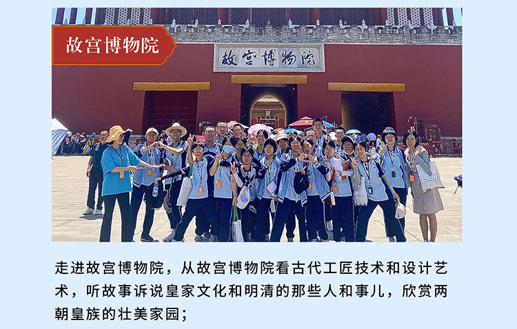 课 2:绘制天安门广场平面图;跟随研学老师的讲解,了解天安门广场建筑群的前世今生,激发学生的爱国精神,树立崇高理想,争当时代的接班人课 3:走进故宫博物院,从故宫博物院看古代工匠技术和设计艺术,听故事诉说皇家文化和明清的那些人和事儿,欣赏两朝皇族的壮美家园;课 4:封建时代的辉煌与没落;通过了解故宫的建立、发展和变迁,以及明清两代皇帝在故宫的生活和治理国家的事迹,思考治国为政与修身有怎样的关系,同时思考针
