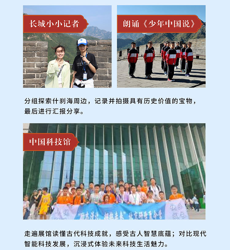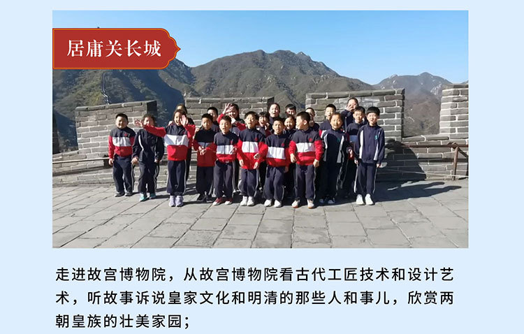 课 2:长城小小记者;分组行动,按照研学任务单对游客进行采访,锻炼学生的团队协作能力与沟通能力,同时观察记录长城的细节和特点,为撰写研学报告打下基础。课 3:朗诵《少年中国说》;在世界八大奇迹之一的长城上朗诵《少年中国说》,寄情于景,让学生分享朗诵后的感受,加深学生们对于《少年中国说》的理解。