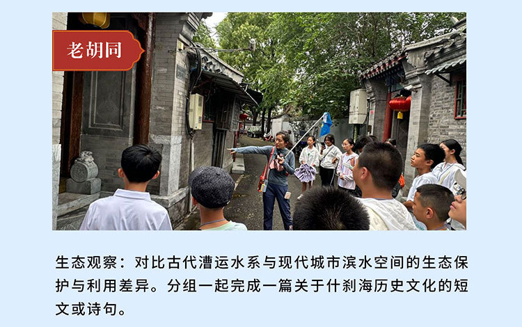 课 3:生态观察:对比古代漕运水系与现代城市滨水空间的生态保护与利用差异。课 4:分组一起完成一篇关于什刹海历史文化的短文或诗句。