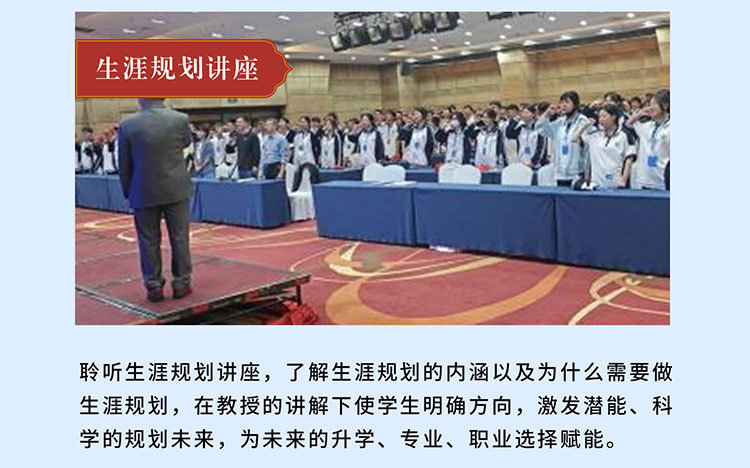 职业生涯规划讲座,聆听生涯规划讲座,了解生涯规划的内涵以及为什么需要做生涯规划,在教授的讲解下使学生明确方向,激发潜能、科学的规划未来,为未来的升学、专业、职业选择赋能。给学生们正确选择升学方向上给予全方位的指导,帮助同学们更好地发掘自身的兴趣和特长。制定适合自己的目标,坚持高效学习方法和良好心态,圆梦心仪大学。