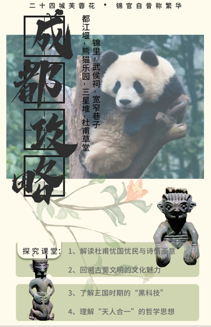 四川大学或西南交大、武侯祠、三星堆博物馆、花重锦官城宽窄巷子、熊猫乐园、都江堰、电子科大、杜甫草堂