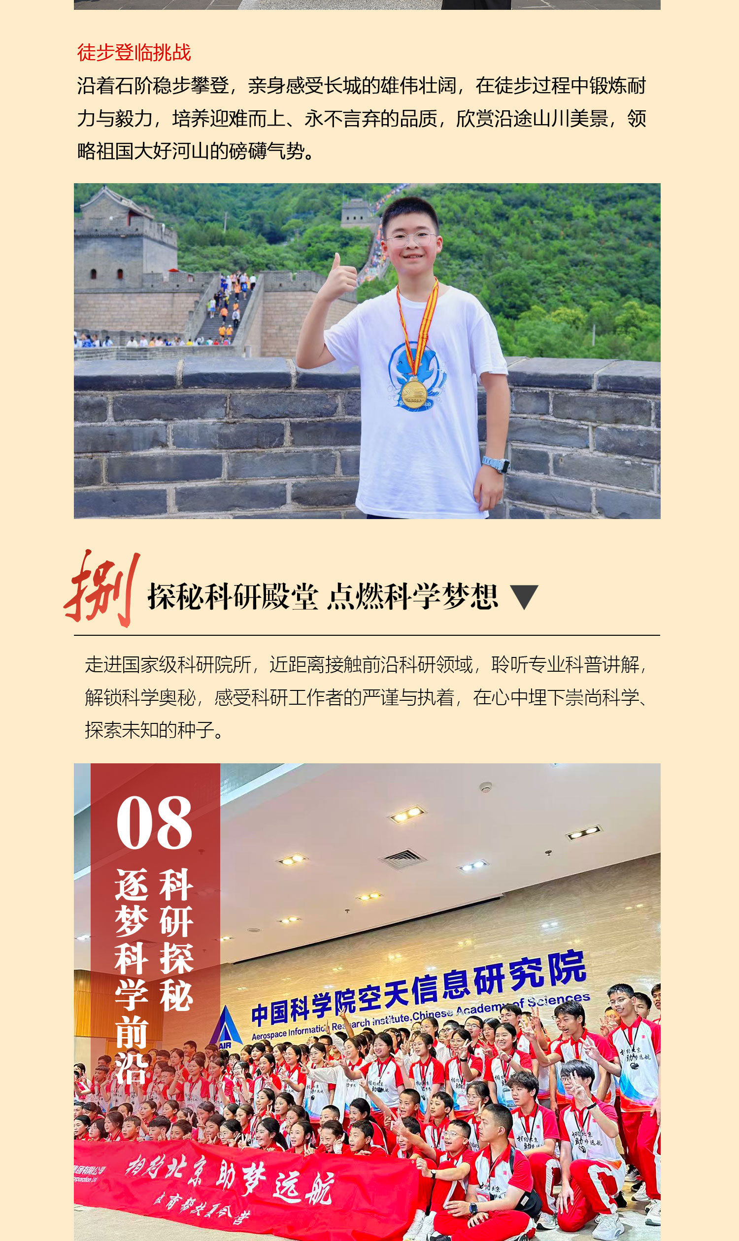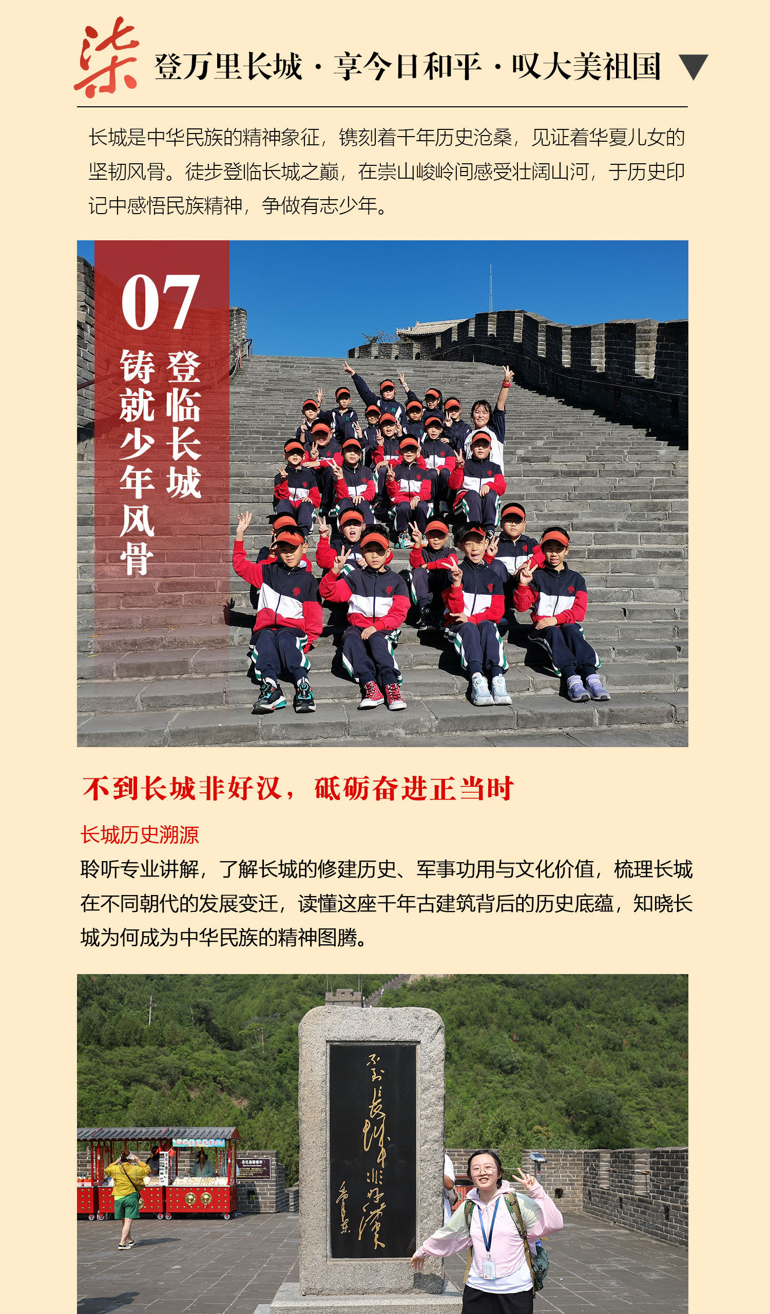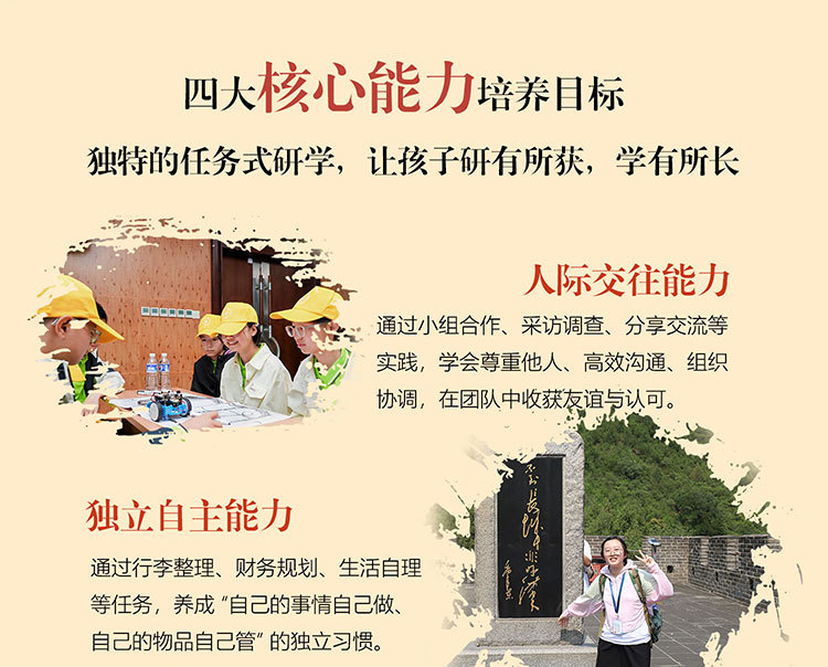 课 2:长城小小记者;分组行动,按照研学任务单对游客进行采访,锻炼学生的团队协作能力与沟通能力,同时观察记录长城的细节和特点,为撰写研学报告打下基础