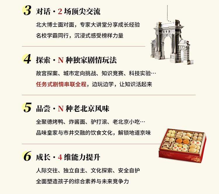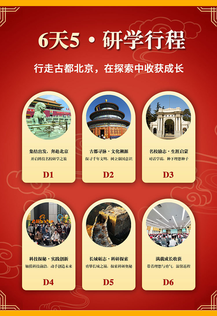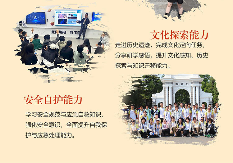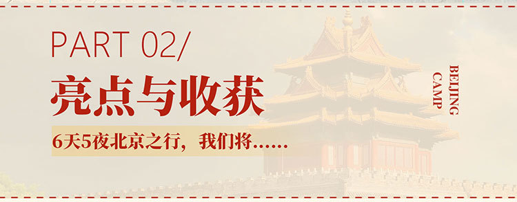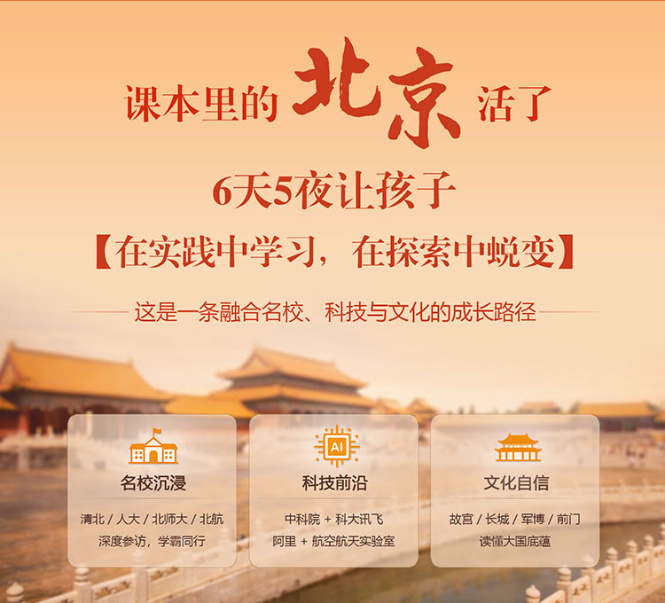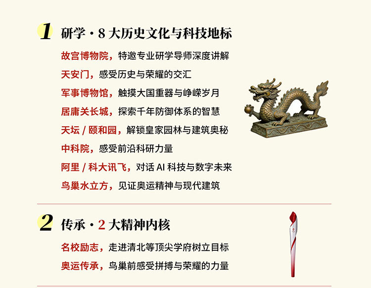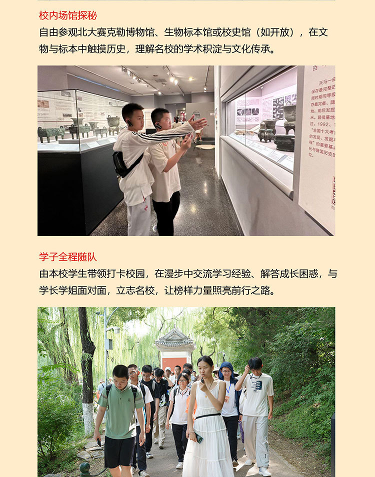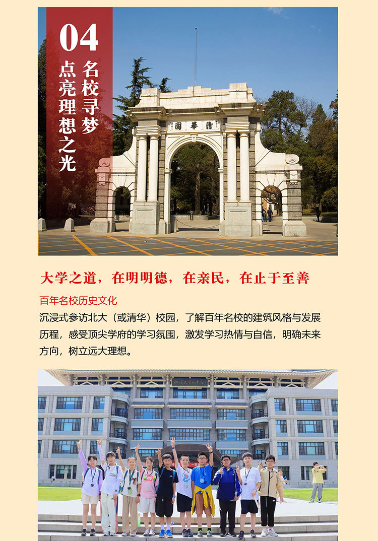 课 1:百年名校历史文化;沉浸式参访校园,了解百年名校的建筑风格,以及北大或清华来时路,感受清北等名校学习氛围,激发学生学习热情和自信,明确未来方向,树立远大理想