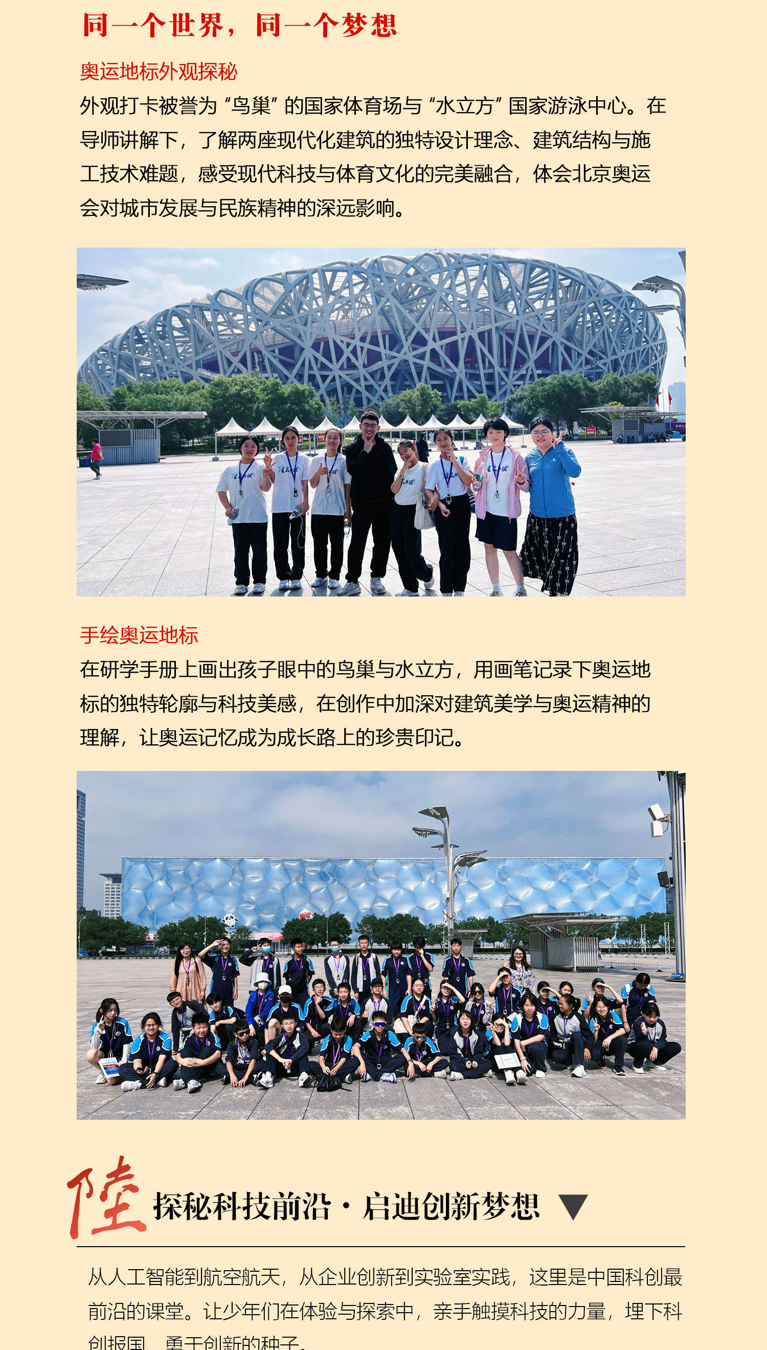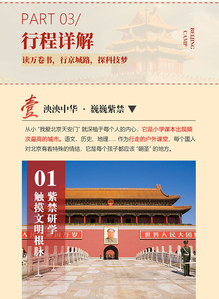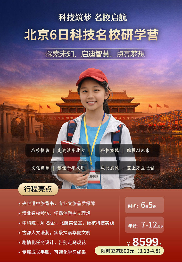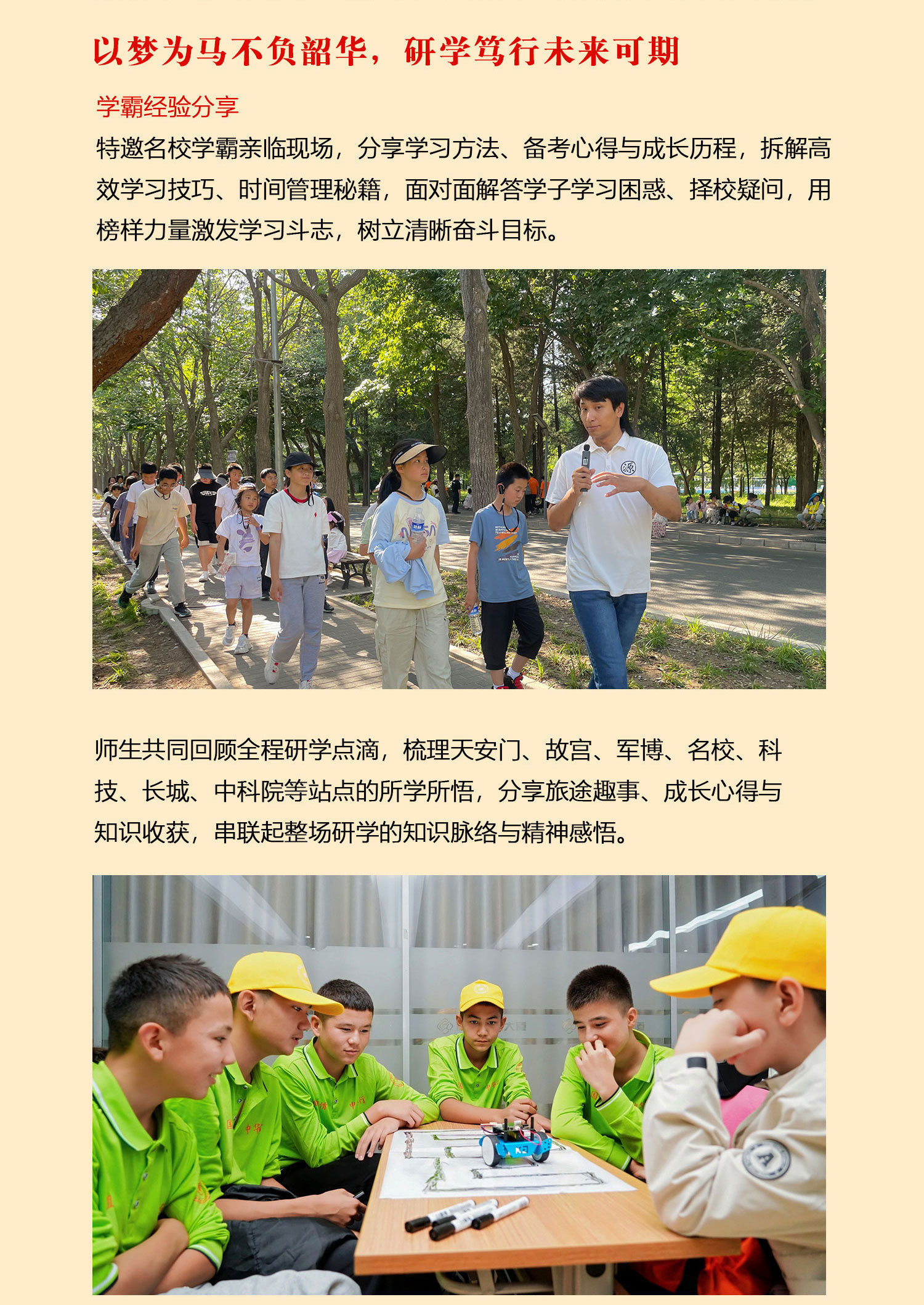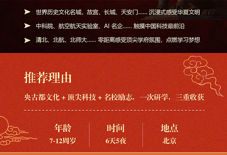 课 1:百年名校历史文化;沉浸式参访校园,了解百年名校的建筑风格,以及北大或清华来时路,感受清北等名校学习氛围,激发学生学习热情和自信,明确未来方向,树立远大理想